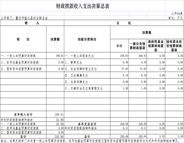 1.收入情况。2021年度一般公共预算财政拨款收入199.81万元,较上年决算数减少29.65万元,下降12.9%。主要原因财政拨款预算减少。较年初预算数增加47.00万元,增长30.8%。主要原因是市级部门下拨款群团事业发展资金未纳入年初预算、元旦春节妇女儿童慰问金未纳入年初预算。此外,年初财政拨款结转和结余55.88万元。