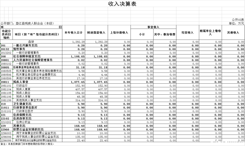 2.收入情况。2022年度收入合计1,292.29万元,较上年决算数减少150.14万元,下降10.4%,主要原因是上年度与总社合并决算,本年度单独核算并决算以及残疾人经费减少。其中:财政拨款收入1,292.29万元,占100.0%。此外,年初结转和结余15.76万元。
