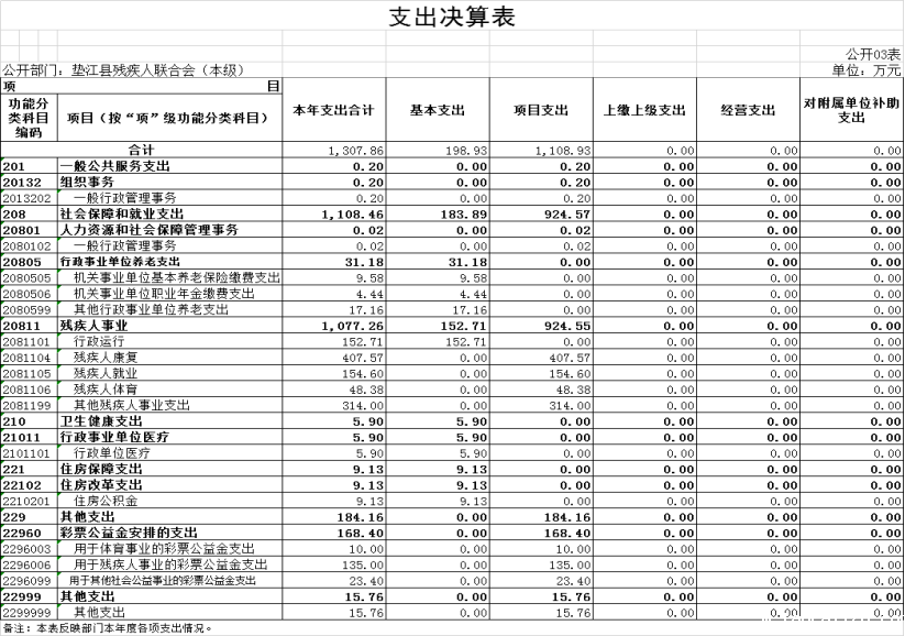 3.支出情况。2022年度支出合计1,307.86万元,较上年决算减少234.76万元,下降15.2%,主要原因是上年度与总社合并决算,本年度单独核算并决算以及残疾人经费减少,支出减少。其中:基本支出198.93万元,占15.2%;项目支出1,108.93万元,占84.8%。