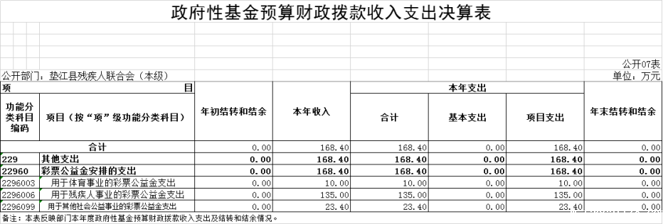 2022年度政府性基金预算财政拨款年初结转结余0万元,年末结转结余0万元。本年收入168.4万元,较上年决算数减少48.91万元,下降22.5%,主要原因是财政下达的政府性基金较去年减少。本年支出168.4万元,较上年决算数减少48.91万元,下降22.5%,主要原因是收入减少,支出减少。