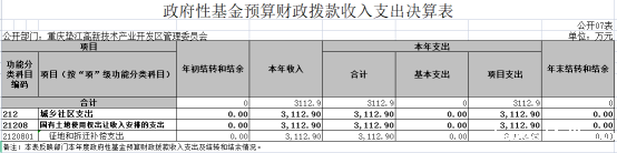 2022年度政府性基金预算财政拨款年初结转结余0万元,年末结转结余0万元。本年收入3,112.9万元,较上年决算数减少15235.67万元,减少83.03%,主要原因是项目减少,相应收入减少。本年支出3,112.9万元,较上年决算数减少15235.67万元,减少83.03%,主要原因是项目减少,相应支出减少。
