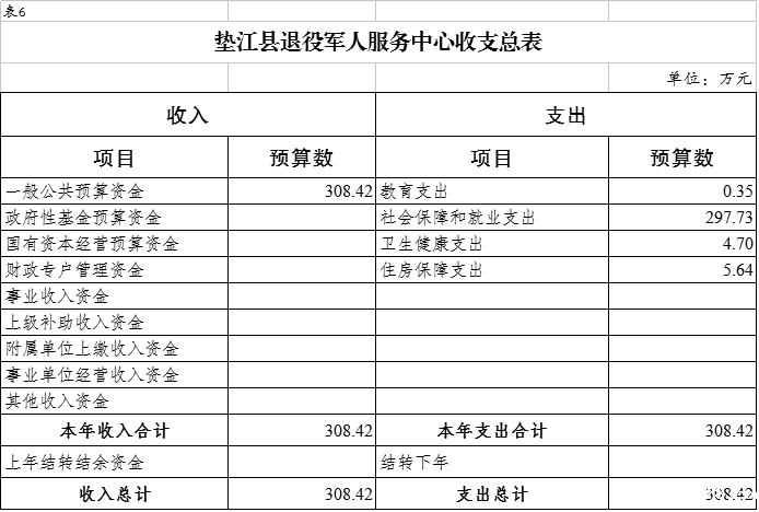 (一)收入预算:2022年年初预算数308.42万元,其中:一般公共预算拨款308.42万元,政府性基金预算拨款0万元,国有资本经营预算收入0万元,事业收入0万元,事业单位经营收入0万元,其他收入0万元;收入较去年增加308.42万元,主要原因是2022年县退役军人服务中心单独预算。