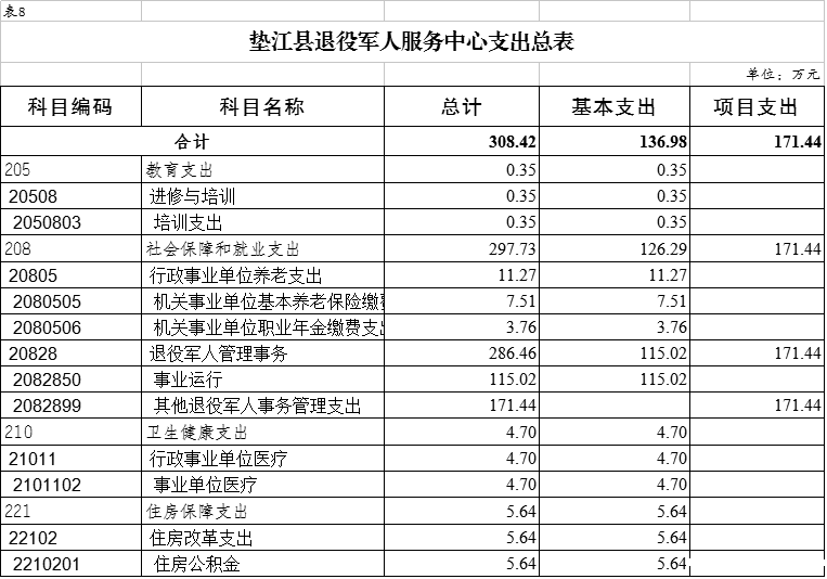 2022年一般公共预算财政拨款收入308.42万元,一般公共预算财政拨款支出308.42万元,比2021年增加308.42万元。其中:基本支出136.98万元,比2021年增加136.98万元,主要原因是2022年县退役军人服务中心单独预算,主要用于保障在职人员工资福利及社会保险缴费,保障部门正常运转的各项商品服务支出;项目支出171.44万元,比2021年增加171.44万元,主要原因是2022年县退役军人服务中心单独预算,主要用于社区退役服务站工作。