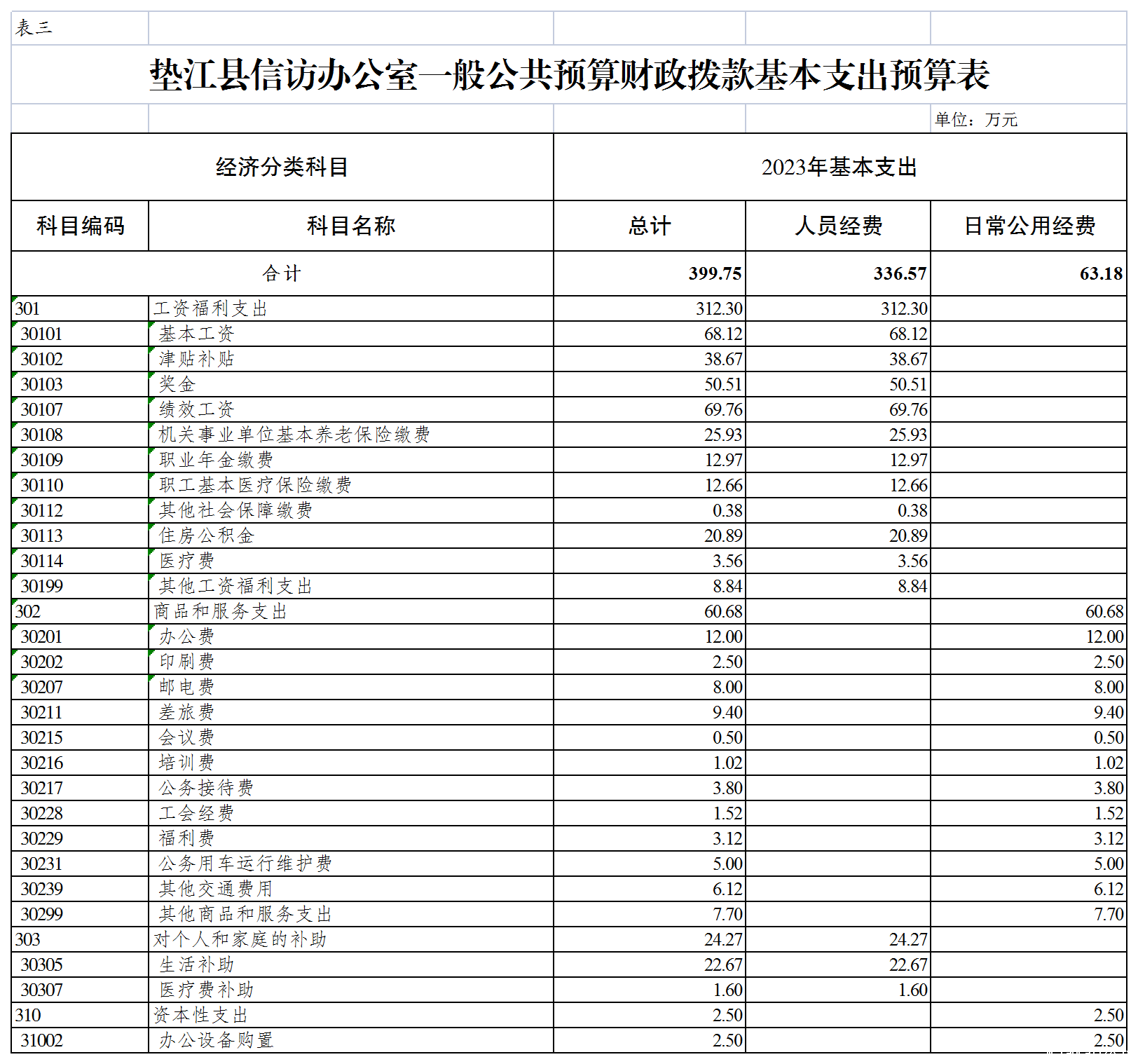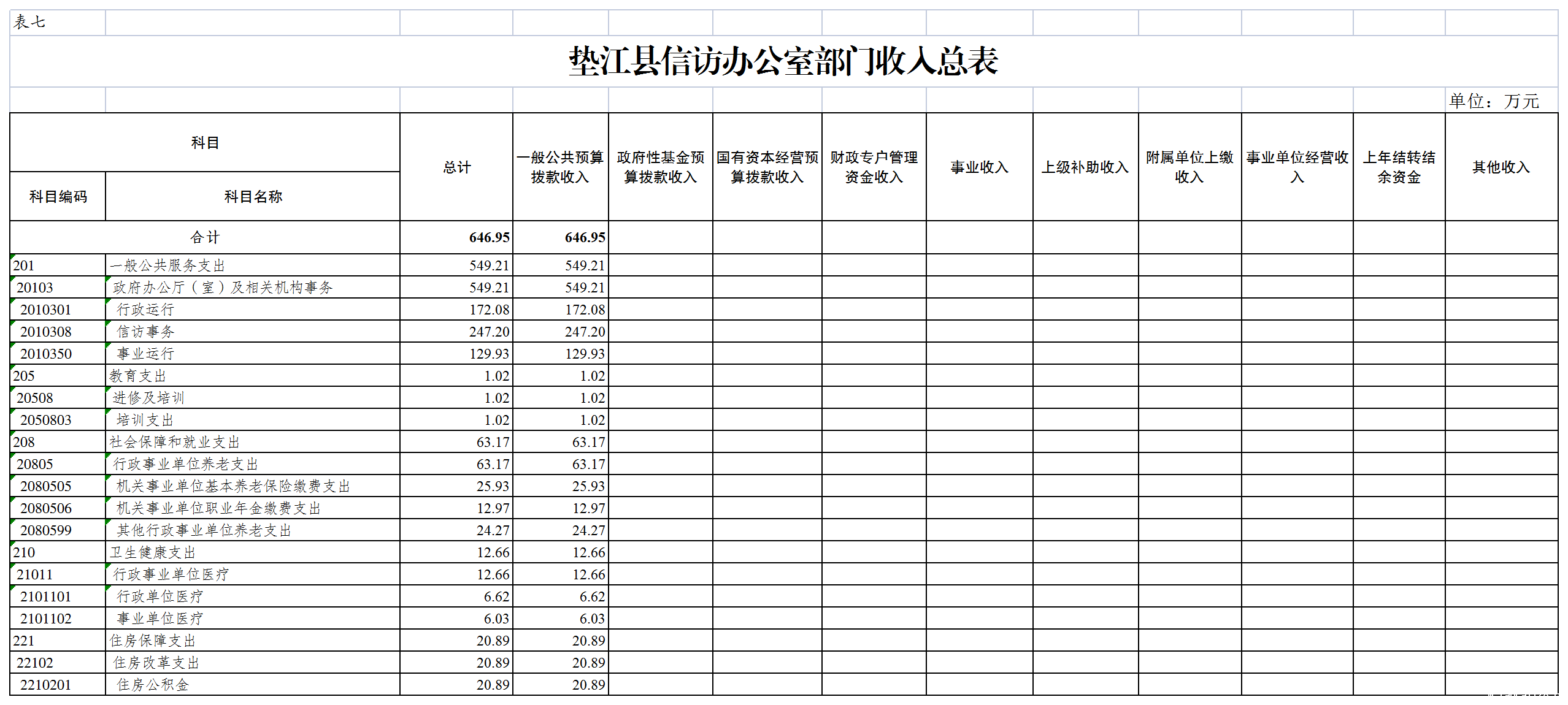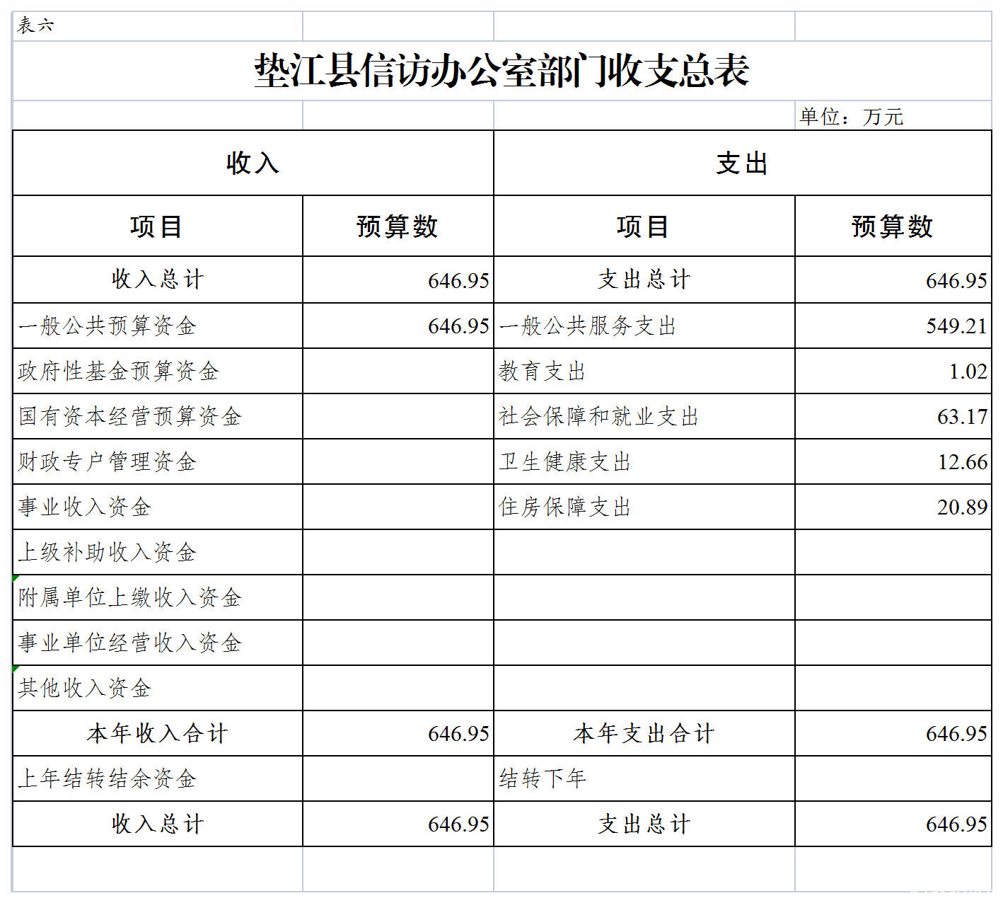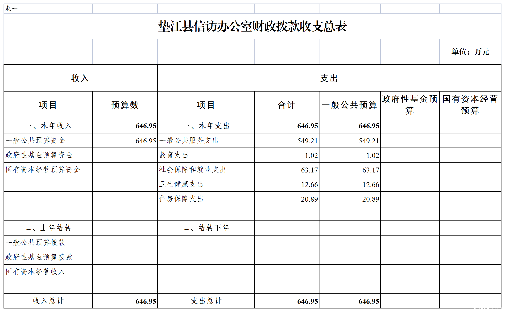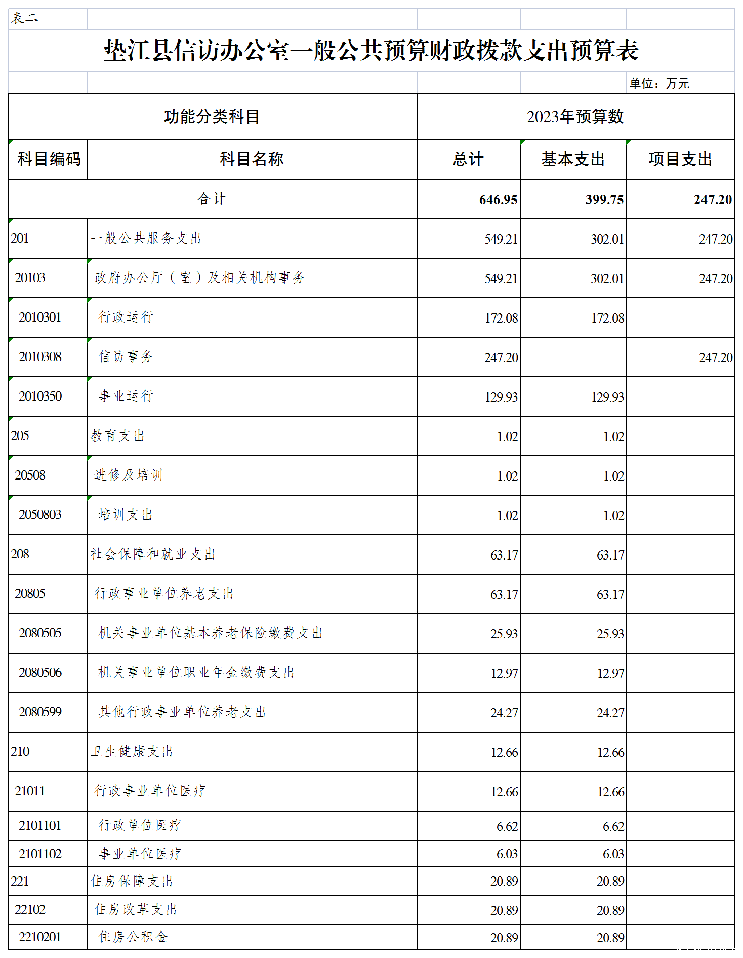2023年一般公共预算财政拨款收入646.95万元,一般公共预算财政拨款支出646.95万元,比2022年减少62.16万元。其中:基本支出399.75万元,比2022年增加12.76万元,主要原因是基本经费预算拨款增加,主要用于保障在职人员工资福利及社会保险缴费、离休人员离休费、退休人员补助等,保障部门正常运转的各项商品服务支出;项目支出247.20万元,比2022年减少74.92万元,主要原因是厉行节约,主要用于信访稳定重点工作。上年结转结余行政运行公用经费0.01万元。
