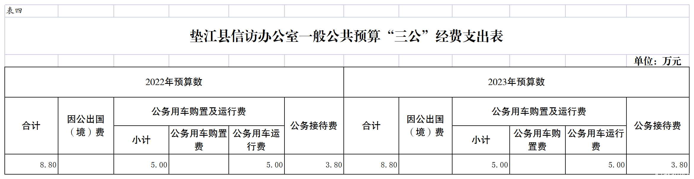 2023年“三公”经费预算8.8万元,比2022年不变。其中:因公出国(境)费用0万元,比2022年不变,主要原因是2023年无因公出国(境)费用;公务接待费3.8万元,比2022年不变,主要原因是认真贯彻落实中央八项规定和厉行节约要求,强化公务接待支出管理严格遵守公务接待开支范围和开支标准,严格控制陪餐人数,对应由接待对象承担的费用一律由接待对象自行支付,公务接待费严格控制;公务用车运行维护费5.00万元,比2022年不变,主要原因是信访稳定工作量加大,维护社会稳定,需使用公务用车;公务用车购置费0万元,比2022年不变;主要原因是2023年无公务用车购置。