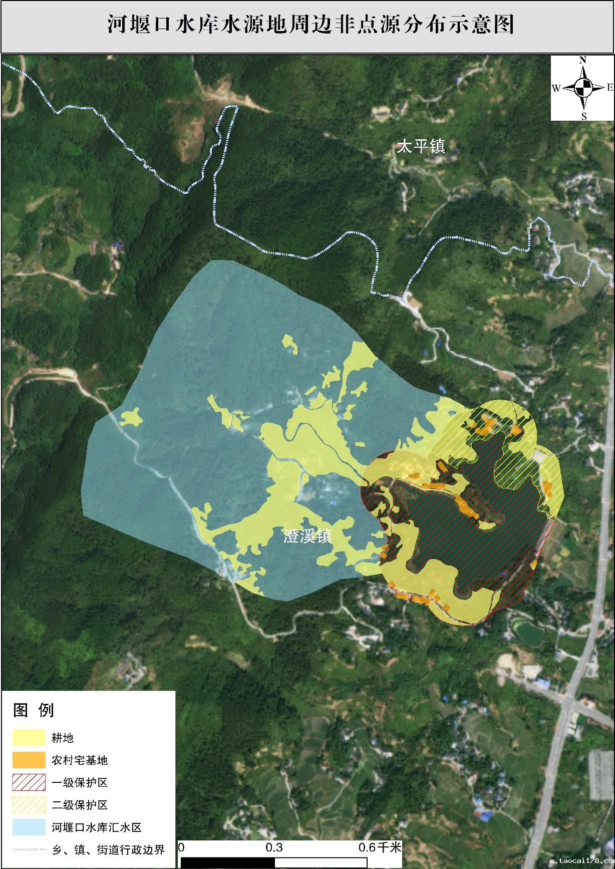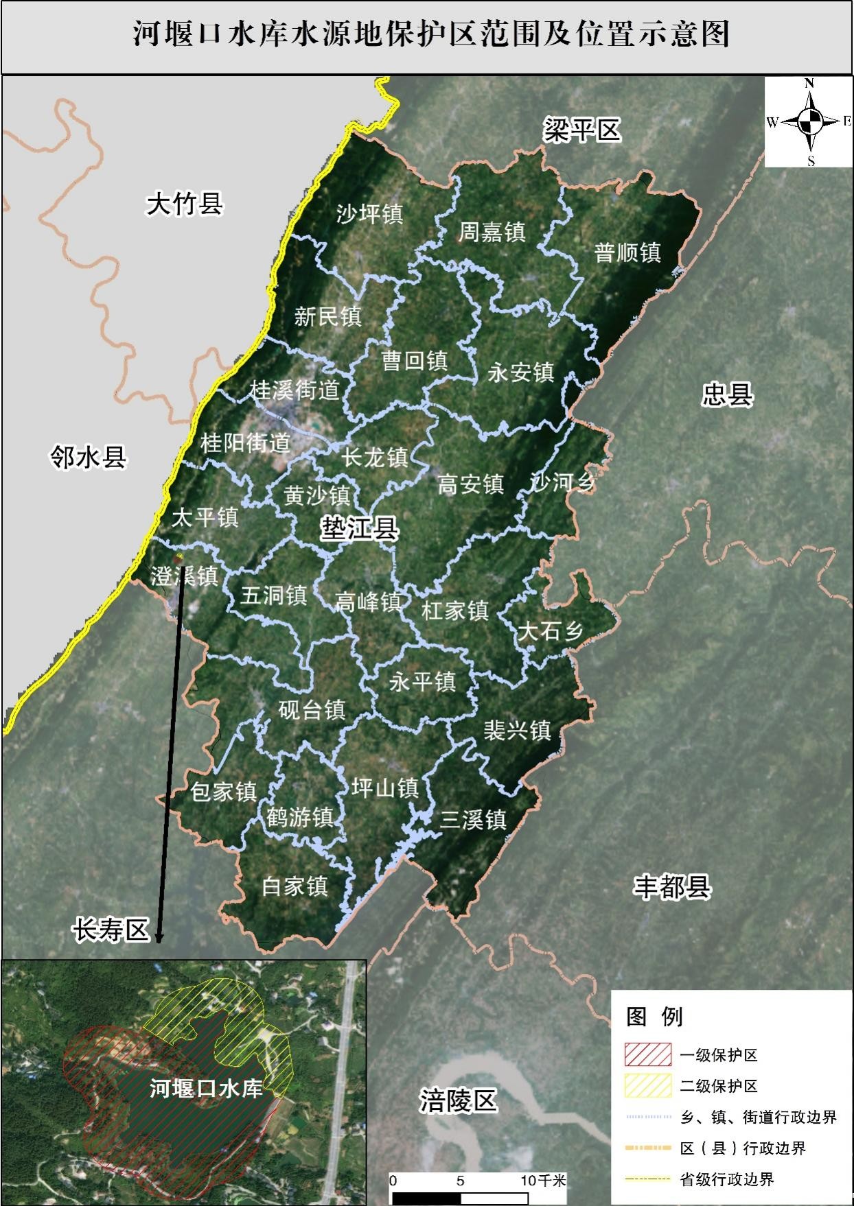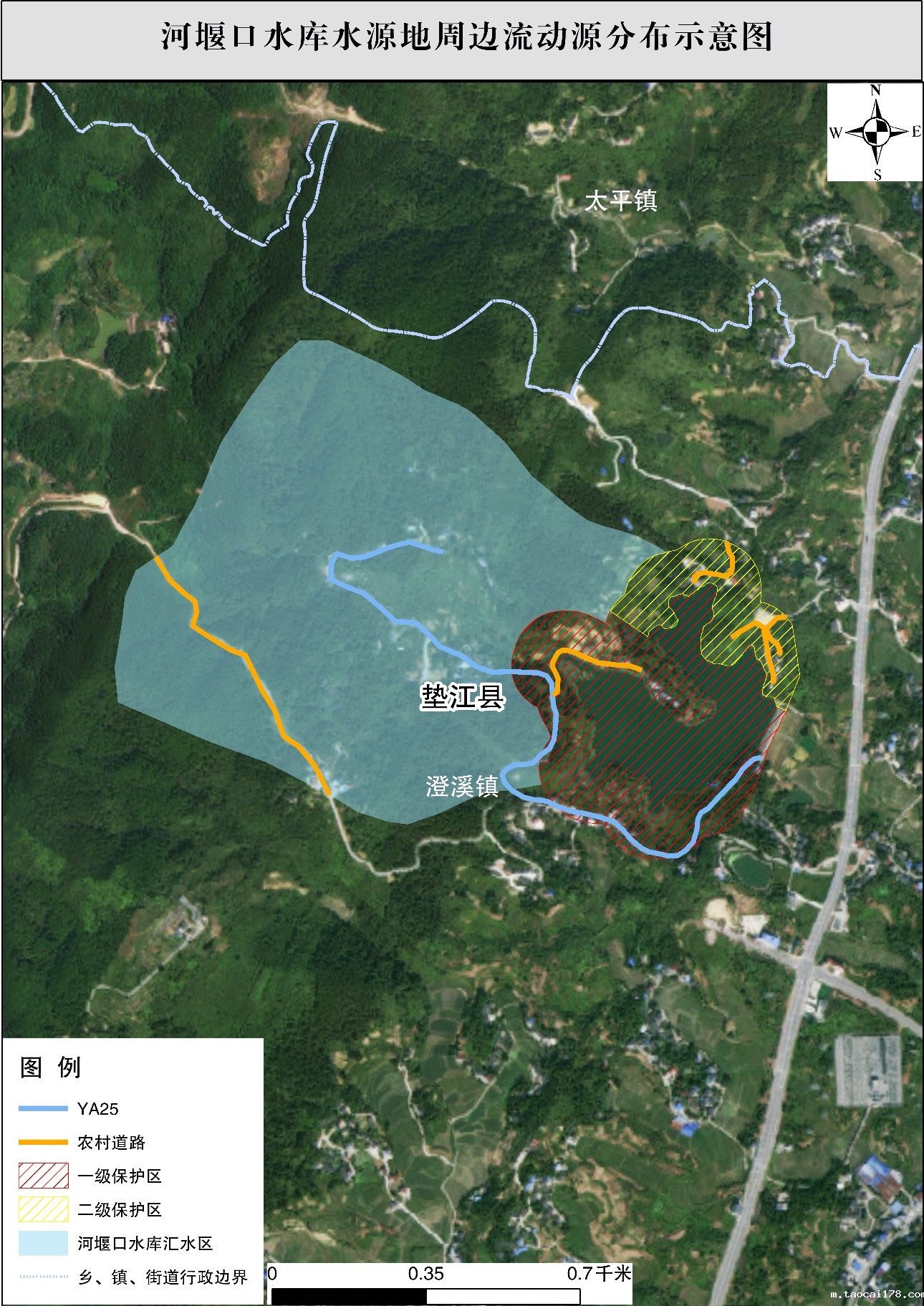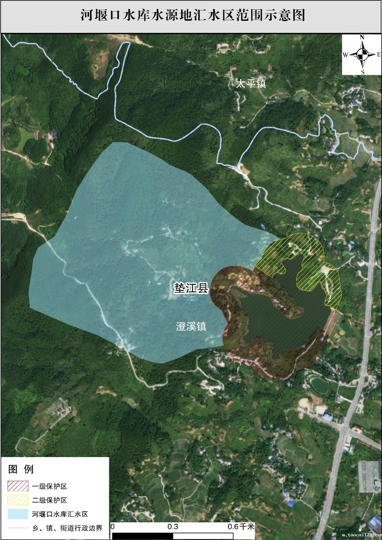 河堰口水库水源地位于垫江县澄溪镇通集村,建成于1959年。水库集雨面积2.96km2,属小(一)型水库,总库容124.81万m3,兴利库容69.3万m3。水库取水口位于东经107°16′5.91″,北纬30°13′58.57″,水源编码为FB6600500231110R0001,水源类型为水库型。水源地目前为澄溪镇通集村和十字村供水,供水水厂为澄溪水厂(澄溪自来水公司),供水人口约7000人,管理单位为重庆澜泉供水有限公司澄溪分公司。水源地一级保护区水域为整个水库正常水位线以下的全部水域,一级保护区陆域为取水口侧正常水位线以上纵深100米范围内的陆域,但不超过分水岭;二级保护区陆域为正常水位线以上(一级保护区以外)库周纵深100米范围内的陆域,但不超过分水岭。