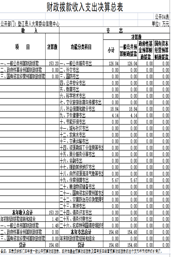2022年度财政拨款收、支总计154.68万元。与2021年相比,财政拨款收、支总计各增加154.68万元,增长0.0%。主要原因是新增2022年决算单位。