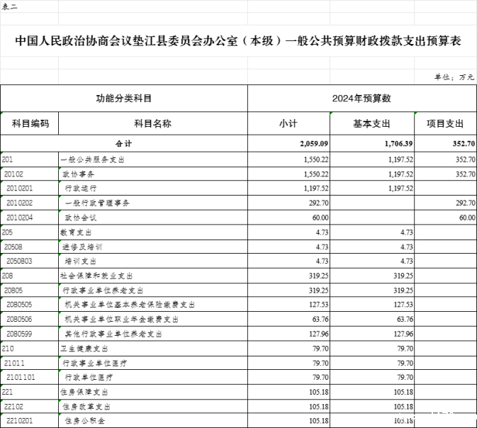 2. 中国人民政治协商会议垫江县委员会办公室(本级)一般公共预算财政拨款支出预算表
