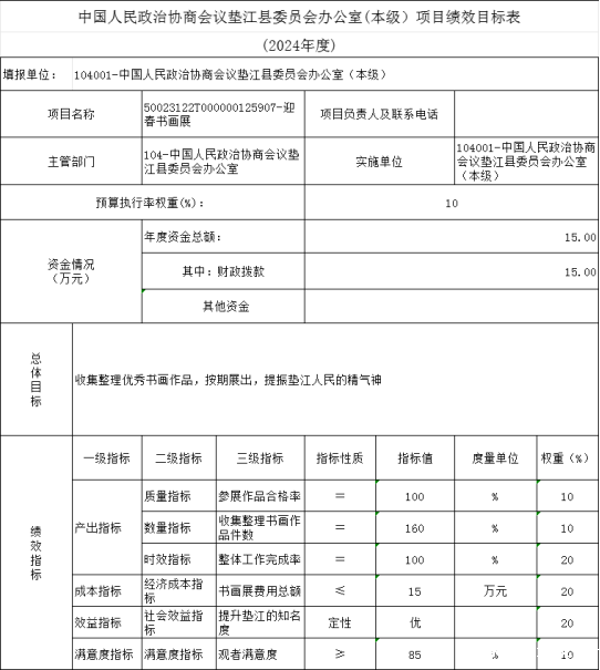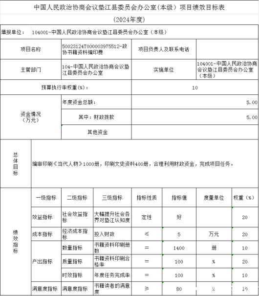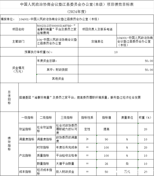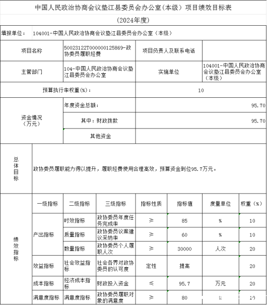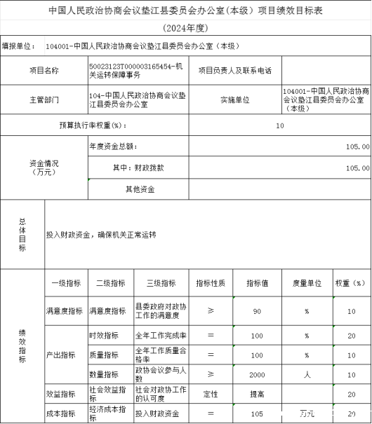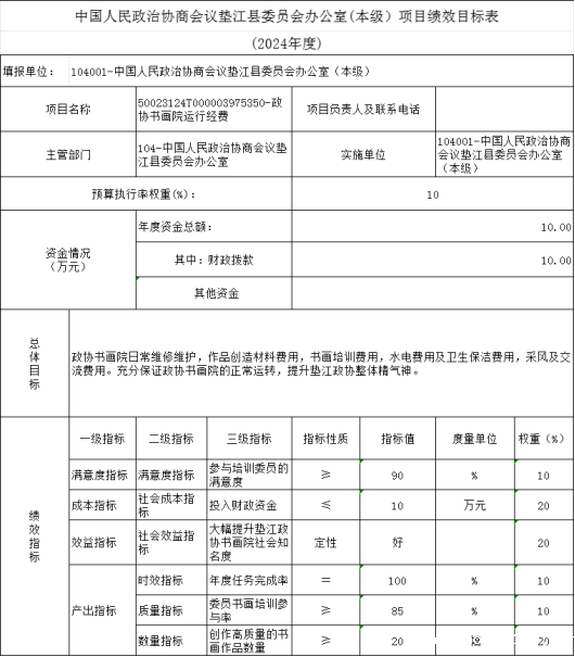 10.中国人民政治协商会议垫江县委员会办公室(本级)2024年项目目标绩效表