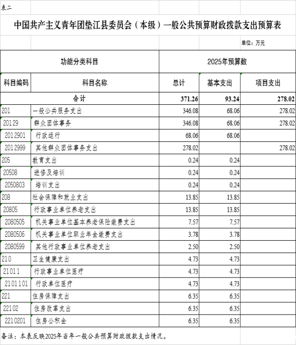 2.中国共产主义青年团垫江县委员会(本级)一般公共预算财政拨款支出预算表