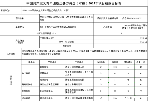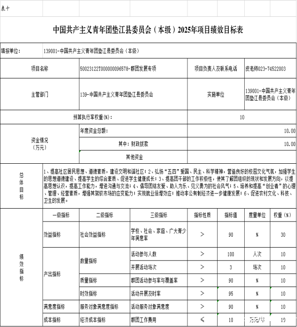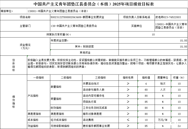 10.中国共产主义青年团垫江县委员会(本级)2025年项目绩效目标表