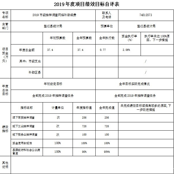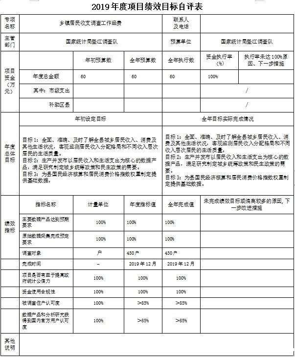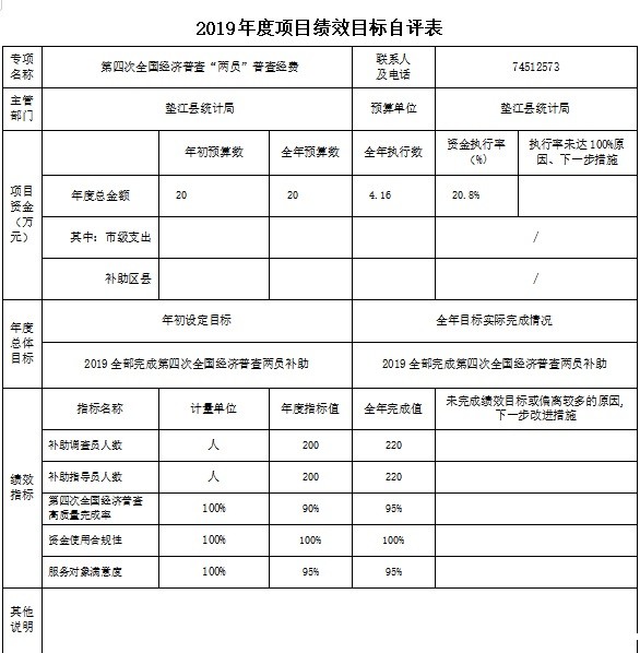 根据预算绩效管理要求,本部门对5个项目开展了绩效自评,其中,以填报目标自评表形式开展自评5项,涉及财政到位资金465.4万元。从评价情况来看,2019年圆满完成第四次全国经济普查及“两员”补助工作。普查过程中共进行6次业务培训,共普查全县法人企业户数8383户,个体户数44120户,全县2018年GDP总量375亿元。2019年网络抽样调查,完成了规下工业企业样本调查、资质外建筑企业调查、资质外房地产企业调查、人口就业调查、限额以下批零住宿餐饮业调查、服务业网络调查、农产量样本调查等13项调查。2019年度顺利完成全县城乡居民收入、消费及其他生活状况,客观监测居民收入分配格局和不同收入层次居民的生活质量;县级粮食调查、畜禽调查、生产并发布与粮食、畜禽相关数据;农产品中间消耗,农产品价格调查,工价调查,房价调查,小微企业跟踪调查,消费者价格调查等各项调查,及时生产并发布了数据,并进行了数据分析,提供了意见建议。