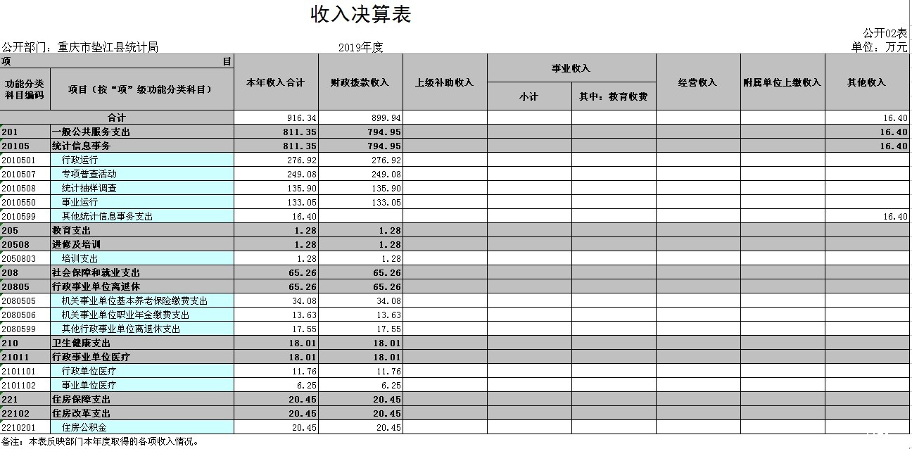 2.收入情况。2019年度收入合计916.34万元,较上年决算数增加259.26万元,增长39.46%,主要原因是人员工资调整、行政运行经费上调、追加部分项目经费。其中:财政拨款收入899.94万元,占98.21%;其他收入16.4万元,占1.79%。此外,年初结转和结余69.31万元。