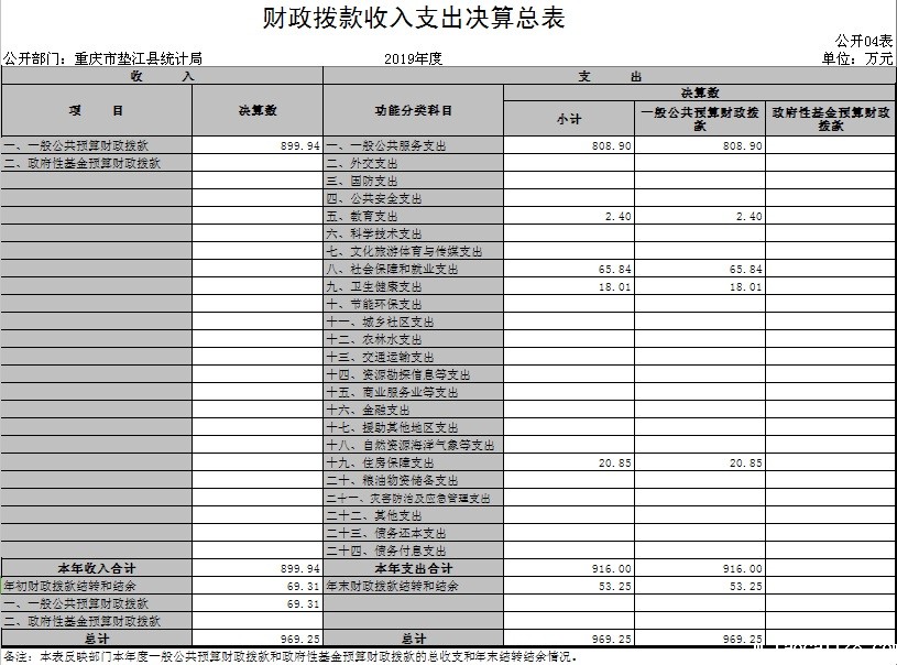 3.结转结余情况。2019年度年末一般公共预算财政拨款结转和结余53.25万元,较上年决算数增加49.87万元,增长1,475.44%,主要原因是市级抽样调查网络补助经费结转和结余。