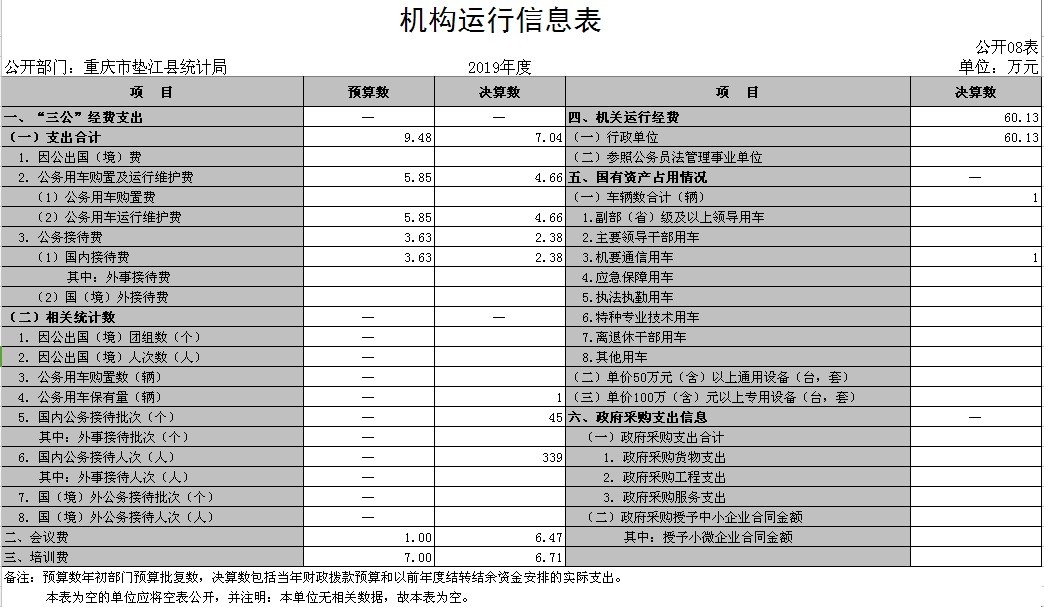 (一)机关运行经费情况说明。2019年度本部门机关运行经费支出60.13万元;其中,机关运行经费主要用于开支办公费11.34万元、印刷费1.3万元、邮电费2.72万元、差旅费2.34万元、会议费0.05万元、培训费1.66万元、公务接待费0.68万元、劳务费3.89万元、工会经费20万元、福利费1.66万元、公务用车运行维护费2.64万元、其他交通费用11.25万元、其他商品和服务支出0.61万元。机关运行经费较上年决算数减少9.38万元,下降13.49%,主要原因是邮电费、差旅费、其他商品服务支出减少。