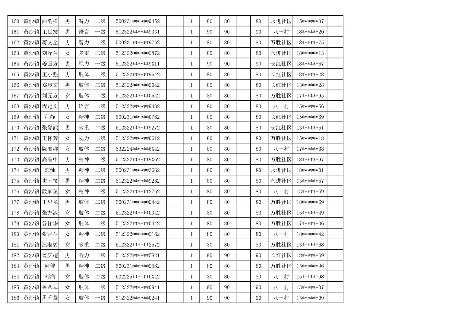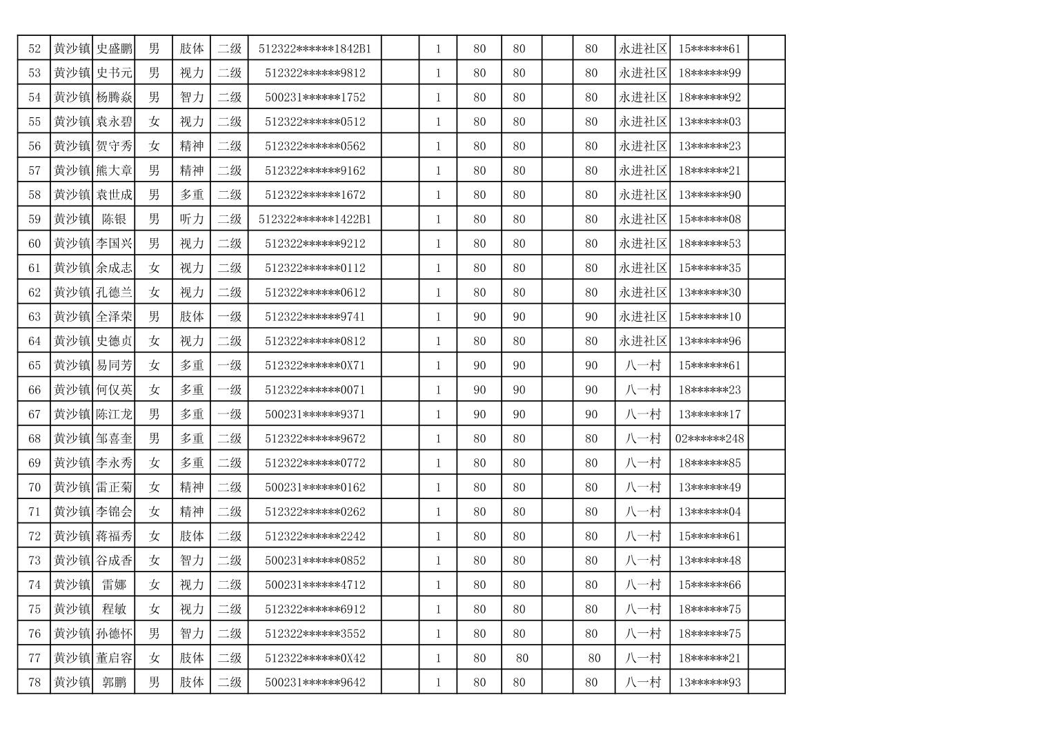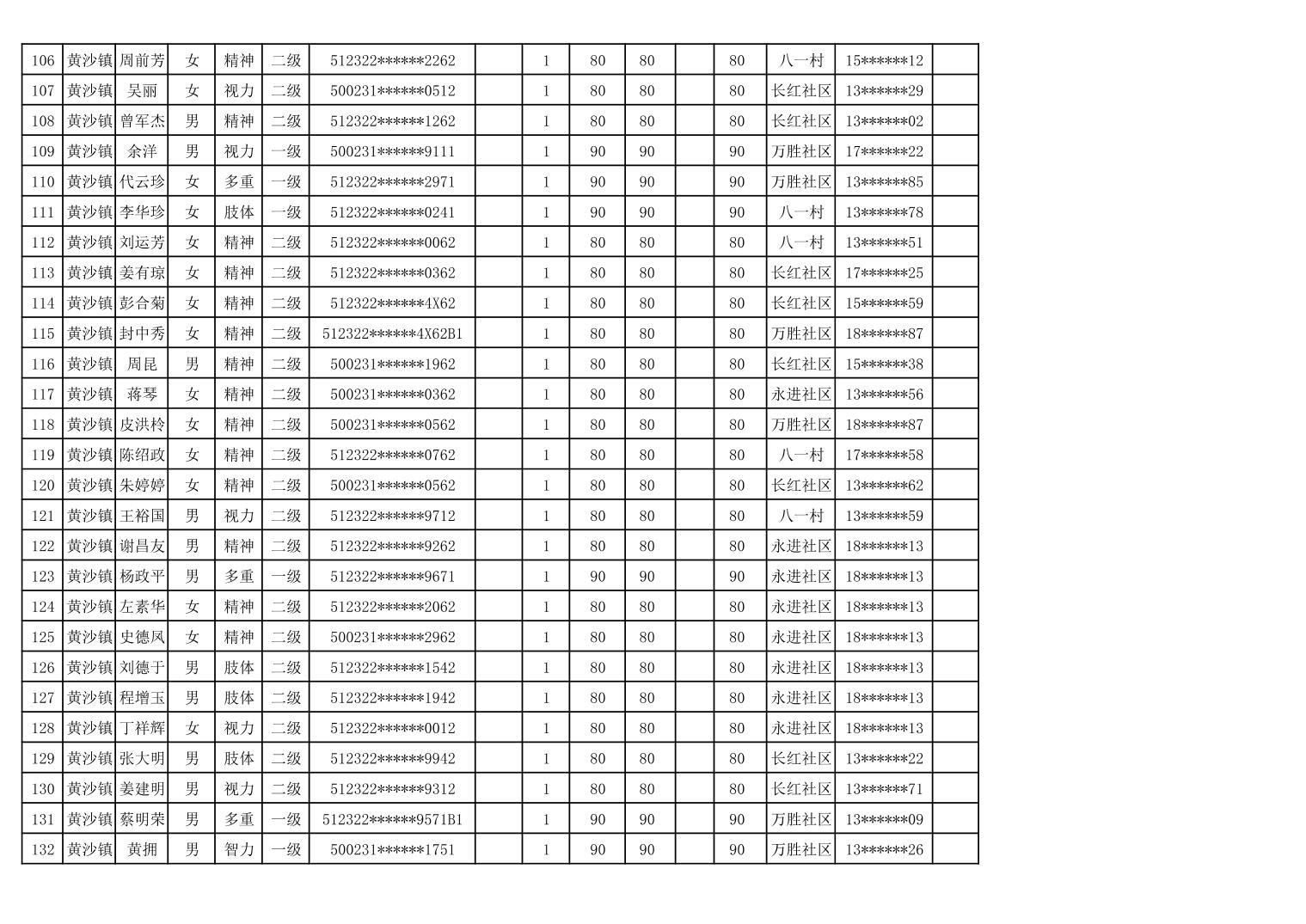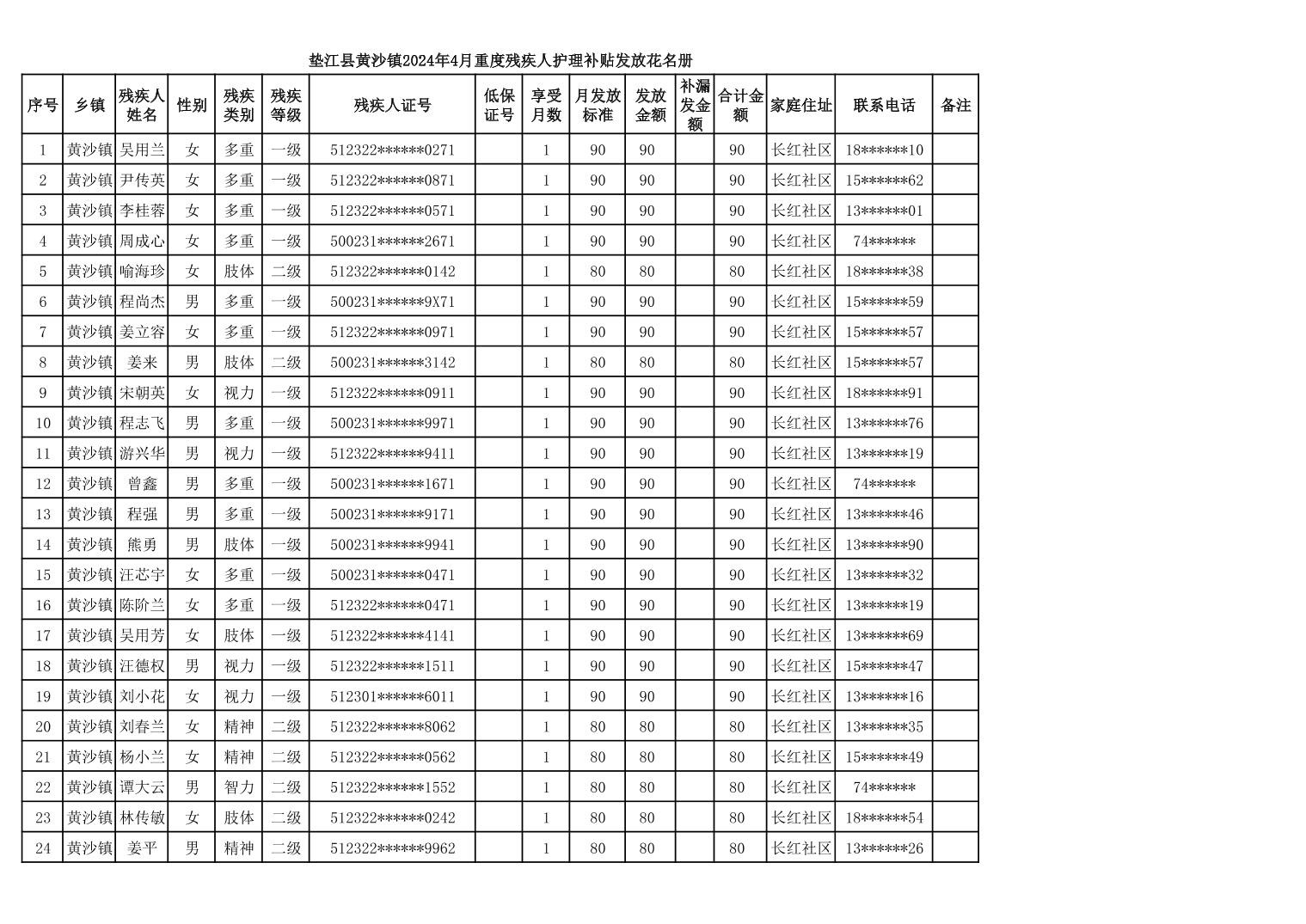 黄沙镇2024年4月贫困残疾人护理补贴花名册