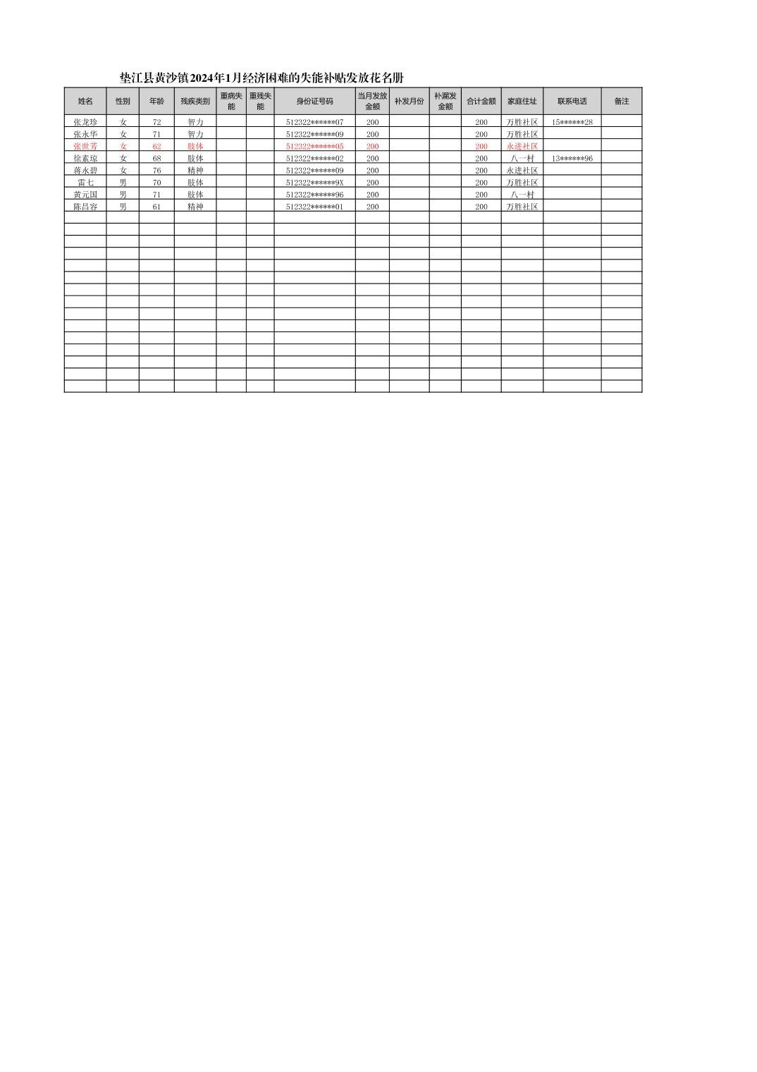 垫江县黄沙镇2024年1月经济困难的失能补贴发放花名册