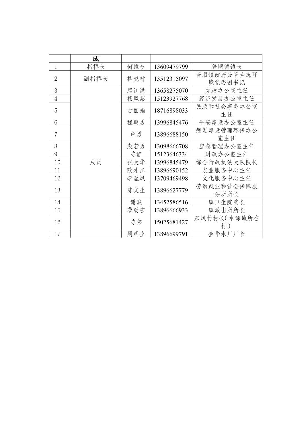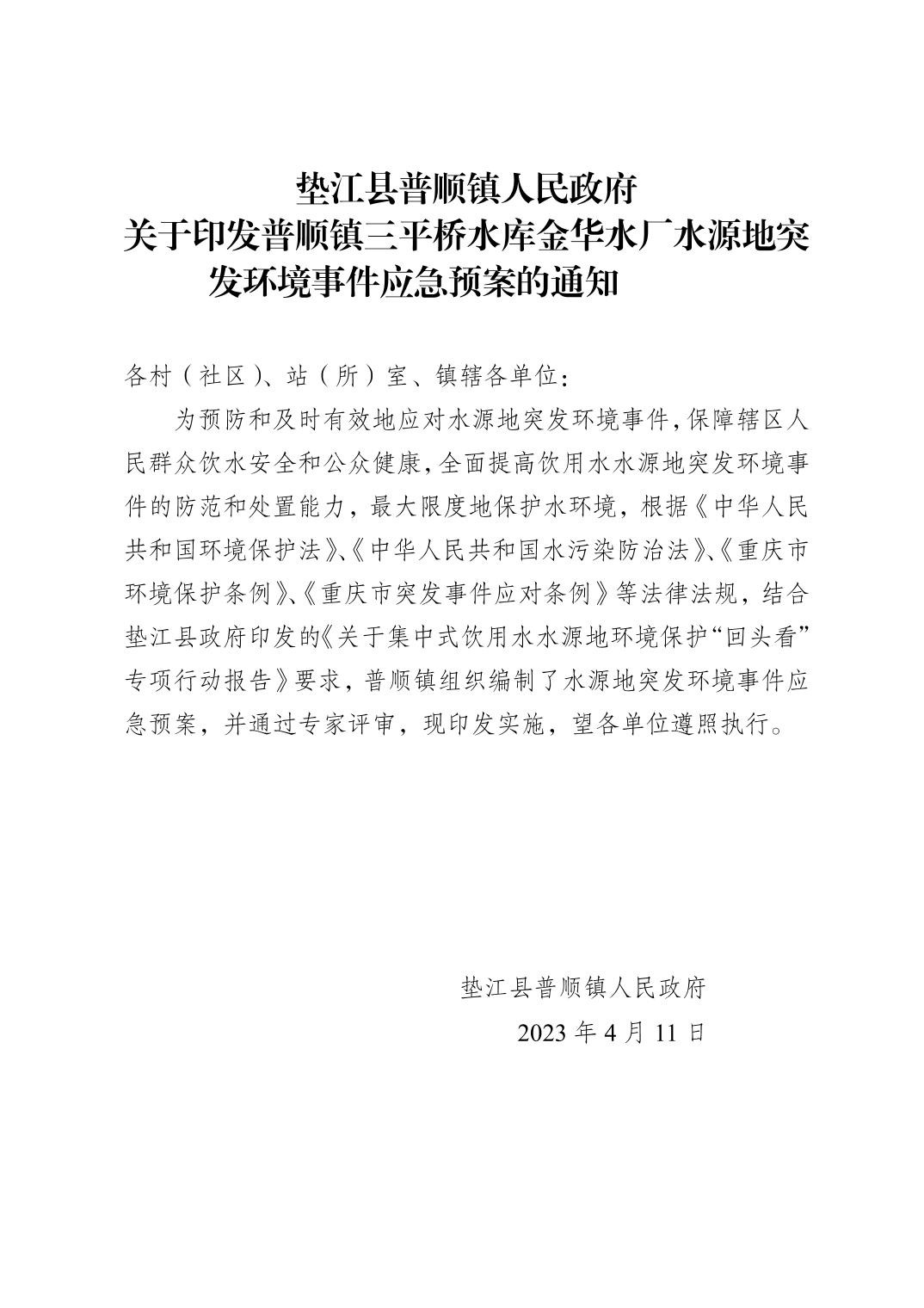 垫江县普顺镇人民政府关于印发普顺镇三平桥水库金华水厂水源地突发环境事件应急预案的通知
