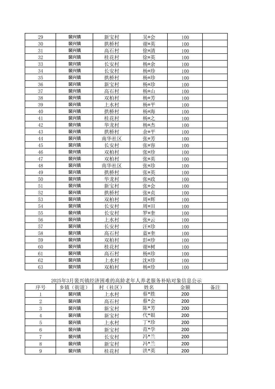 2025年3月裴兴镇高龄三项对象信息公示